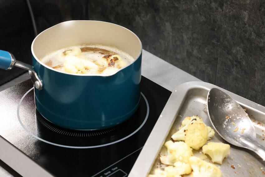 3. Simmer your stock by adding it to the pan over medium heat. Add the roasted cauliflower except for a few florets that you can set aside for garnish. Once the mixture comes to a rolling boil, allow to simmer for 10 minutes.