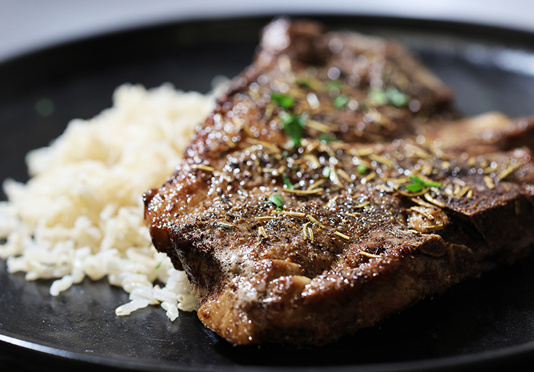Pat the chops dry with a paper towel, and coat both sides with the dry rub, rubbing it into the chops with your fingers.