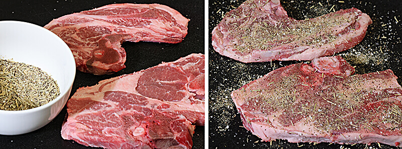 Pat the chops dry with a paper towel, and coat both sides with the dry rub, rubbing it into the chops with your fingers.