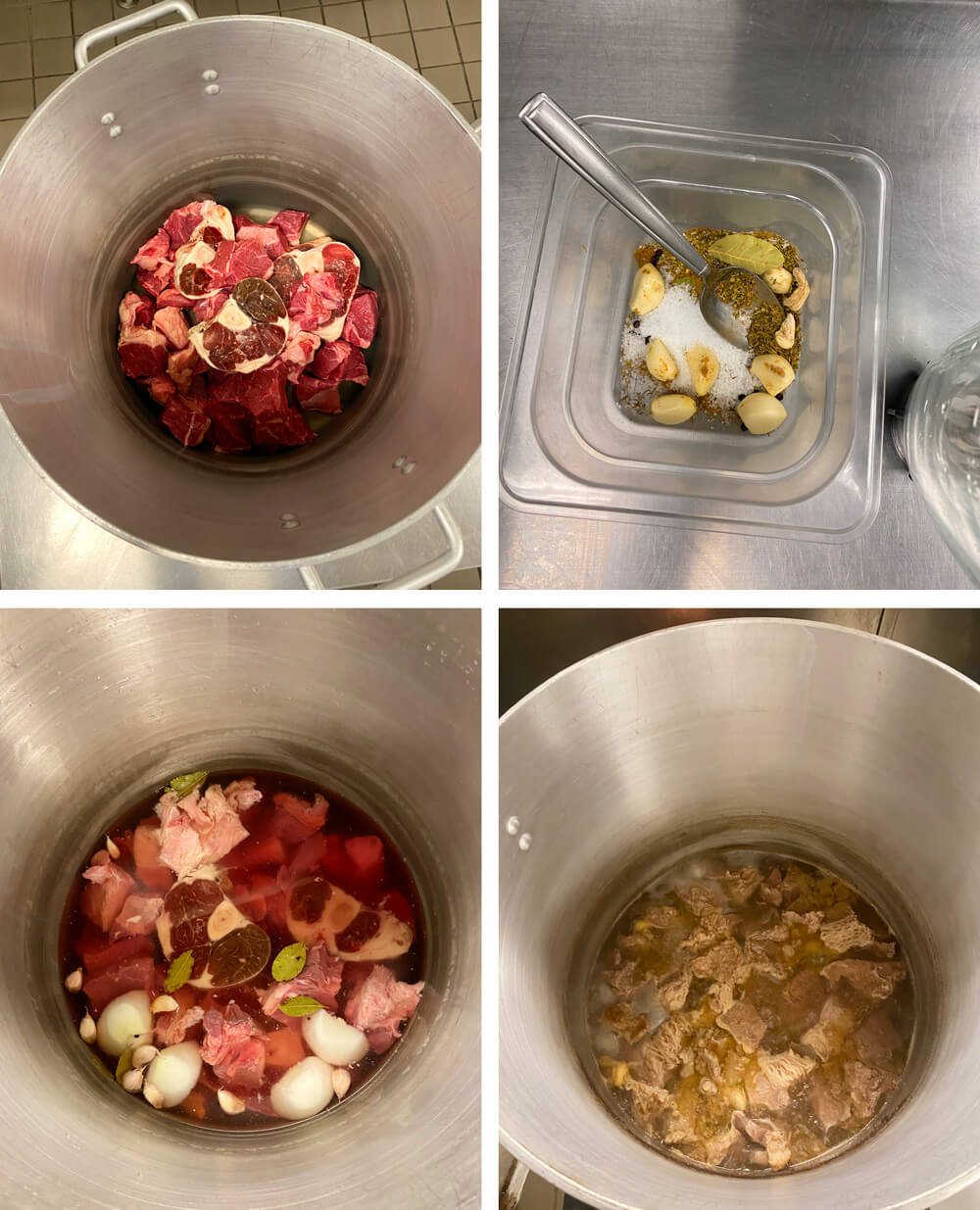 Place the beef in a deep pot, and pour in the beef broth covering the meat. Then, add the spice over it, making sure the meat is covered. Some people like to sear the beef in a tablespoon or two of oil in a sauté pan before adding it to the pot, which will result in some crispier edges and slightly richer flavor. This is similar to a braising technique where meat is seared before being slow cooked.
