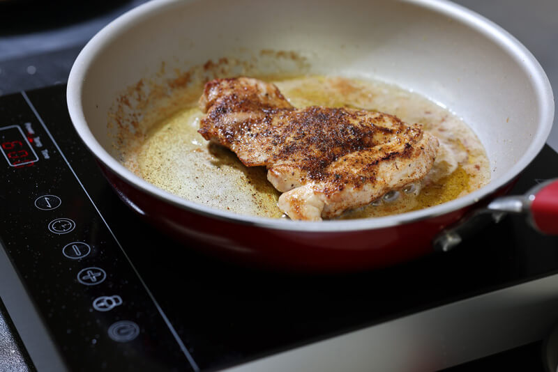 Heat two tsp of olive oil (has to be olive oil for a renal diet recipe) in a large skillet over medium to high heat. Once the pan is hot you can add the chicken and sear it on both sides. After the chicken is in the pan, turn the heat down to low and sauté until cooked thoroughly.