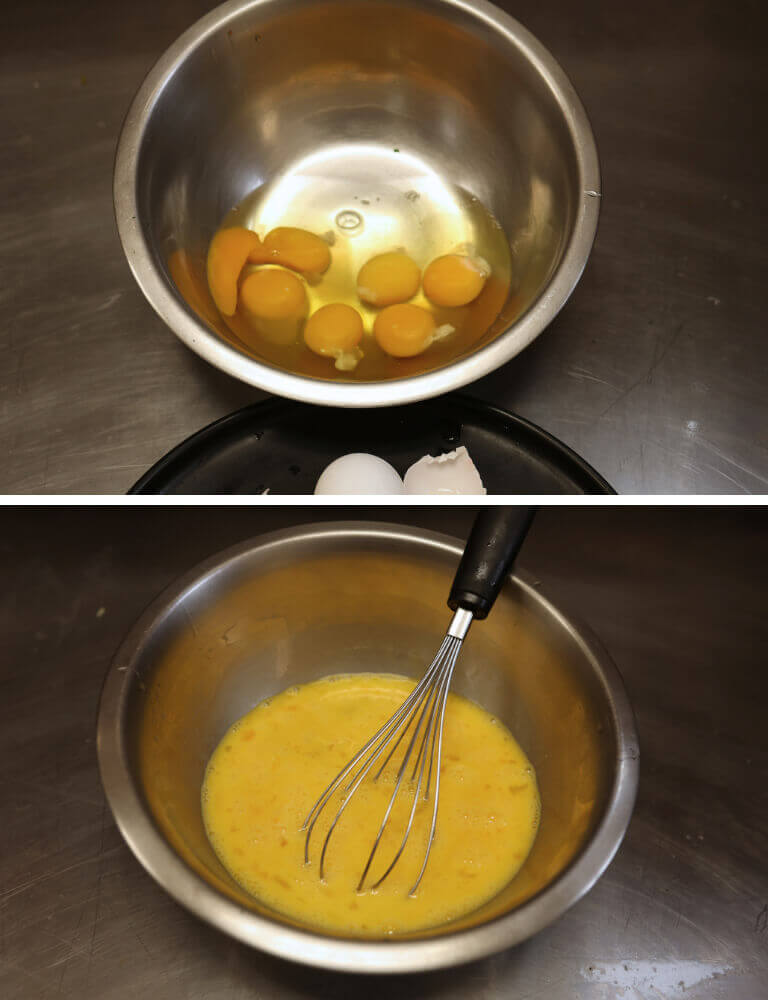 Next whisk the eggs until the yolks and whites are mostly incorporated; this creates ribbons of egg whites and yolks in your cooked dish, resulting in a more complex texture. You may choose to whisk the eggs until fully emulsified, creating a creamier scrambled egg consistency and texture.