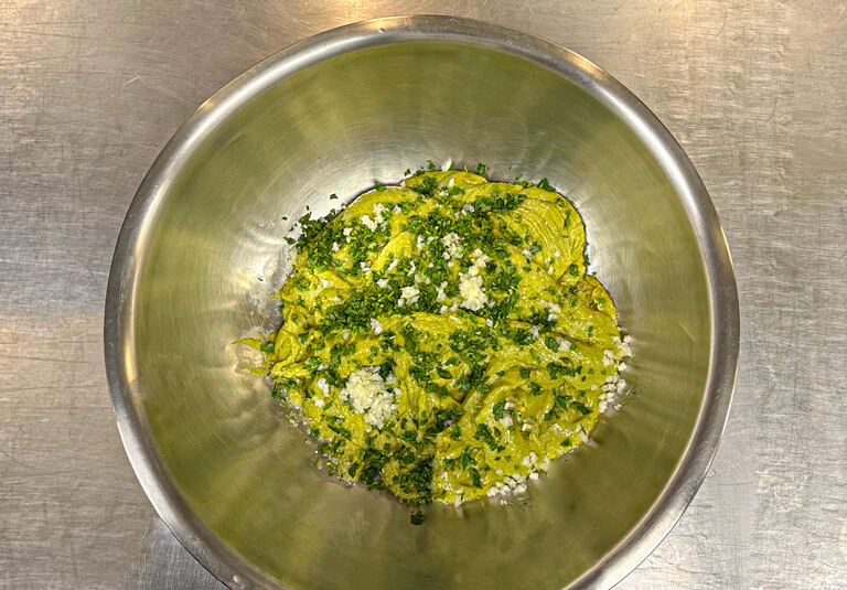 Place the avocado pulp in the bowl. If you are staring with whole avocado cut them in half and remove the kernel and skin. Then place them in a mixing bowl or dough mixer to create a smooth avocado pulp.