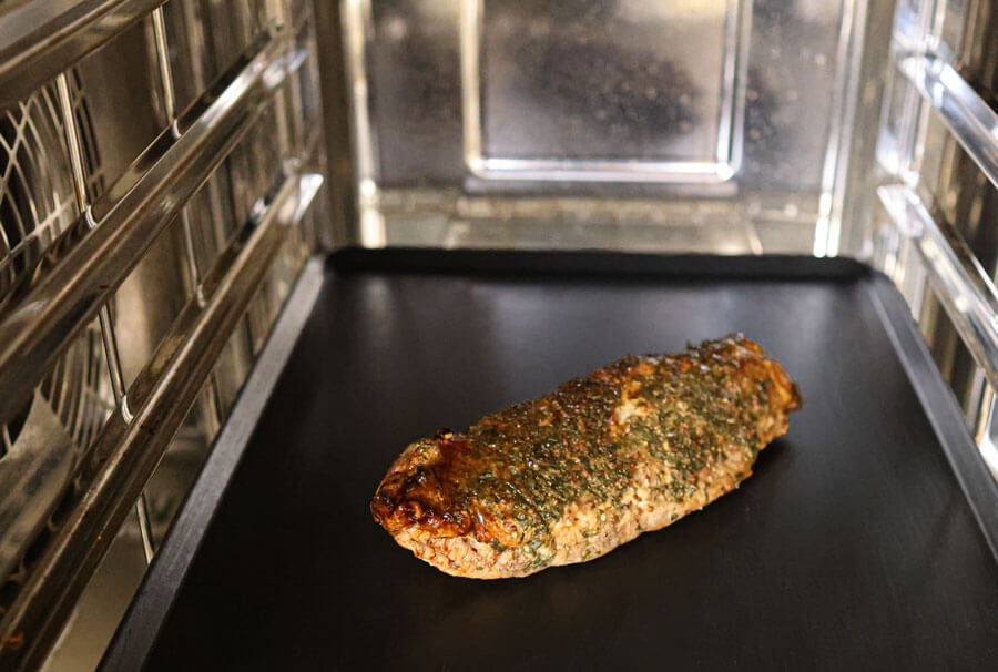 Place the pork loin on a baking sheet or over a roasting pan rack. The roasting pan baking rack will allow the warm air to circulate around the pork loin and it will cook evenly.