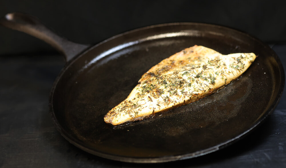 Pat your fish fillet dry using paper towels. Place the Branzino fillet down on a sheet tray and brush lightly with extra virgin olive oil so seasoning will stick to the fish.