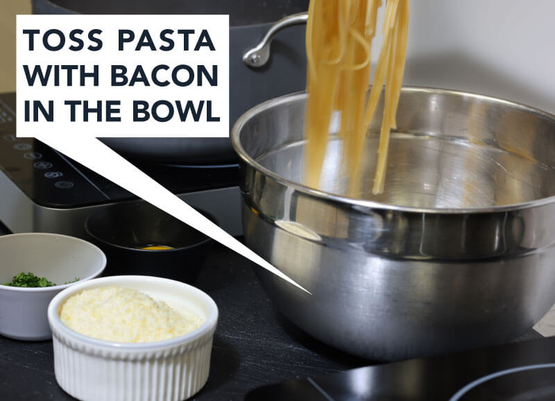 When the linguine pasta is al dente (still a little firm, not mushy), use the tongs to move the steaming hot linguine noodles to the mixing bowl with the crispy bacon. It will be pretty wet, that’s a good thing. Reserve some of the flavorful linguine pasta water.